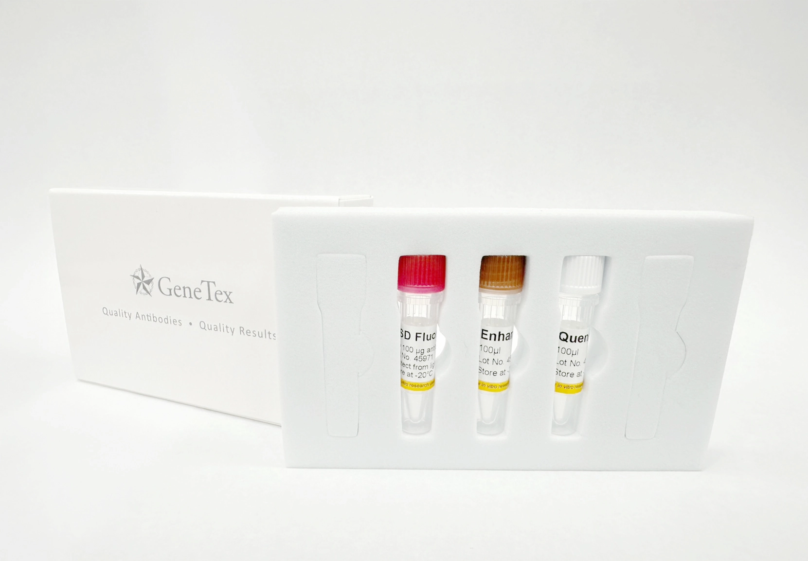 GeneTex FSD Fluor™ antibody labeling kits provide a simple and rapid method to covalently label antibodies with FSD Fluor™ NHS ester fluorescent dyes by way of the ε-amino group of lysines. The protocol requires only 10 minutes of hands-on time and the conjugated antibody is ready to use within one hour. The kits can be used with GeneTex antibodies, recombinant proteins, and biomolecules that are in PBS-only buffer or in PBS buffer with up to 20% glycerol.