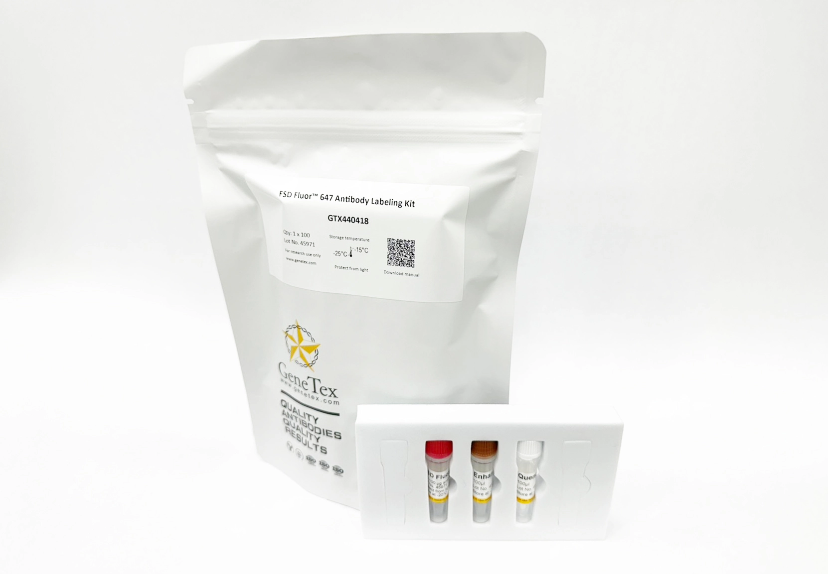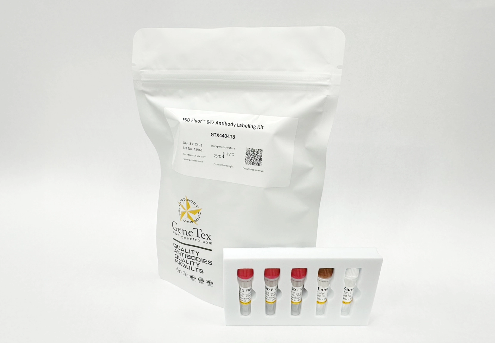 The FSD Fluor™ 647 Antibody Labeling Kit is available in two packing sizes. The 3 x 25 μg package contains three vials of FSD Fluor™ 647 labeling reagents, each capable of labeling 25 μg of antibody. The 1 x 100 μg package contains one vial of FSD Fluor™ 647 labeling reagents, capable of labeling 100 μg of antibody.