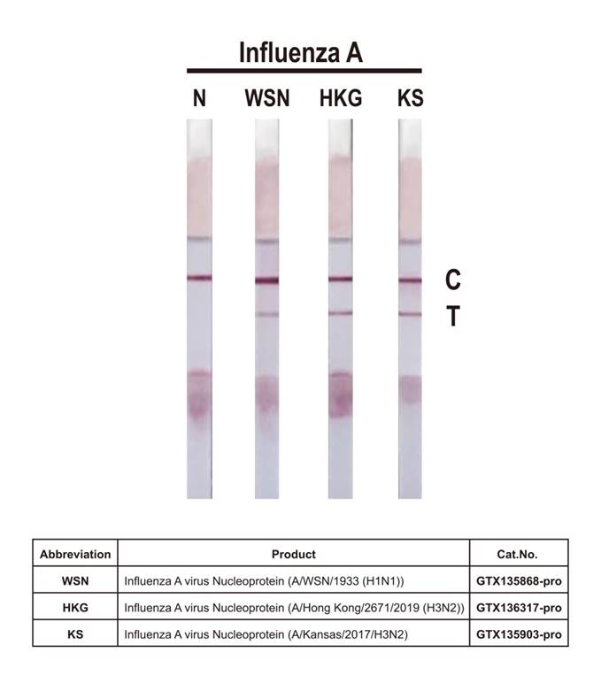 Detection of recombinant influenza A virus nucleoproteins of the indicated strains by lateral flow assay using the recombinant rabbit monoclonal antibody pair. Capture: Influenza A virus Nucleoprotein antibody [HL1089] (GTX636247) Detection: Influenza A virus Nucleoprotein antibody [HL1103] (GTX636318)
