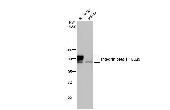 Integrin beta-1 / CD29 antibody detects integrin beta-1 protein (ITGB1), also known as CD29, which forms heterodimeric receptors with at least ten integrin alpha proteins to mediate various aspects of cell adhesion and migration. These functions are essential for embryogenesis, tissue repair, immune function, and other crucial processes in multicellular organisms. Integrin beta-1 has a predicted molecular weight of 88 kDa and exists in multiple isoforms.