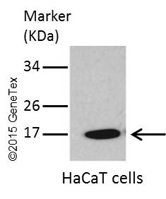 Untreated (–) and treated (+) HeLa whole cell extracts (30 μg) were separated by 15% SDS-PAGE, and the membrane was blotted with LC3B antibody (GTX127375) diluted at 1:2500. The HRP-conjugated anti-rabbit IgG antibody (GTX213110-01) was used to detect the primary antibody.
