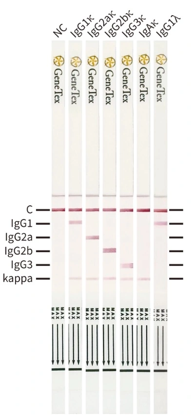 The GeneTex Mouse Monoclonal Antibody lgG Subclass Strip Kit is a qualitative lateral flow assay developed for the rapid identification of mouse monoclonal antibody lgG subclass. It specifically detects lgG1, lgG2a, lgG2b, lgG3, and kappa light chains through an immunochromatographic method.