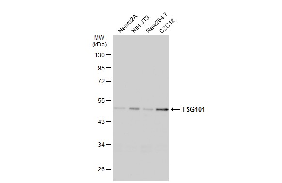 TSG101 antibody [4A10] detects TSG101 protein by western blot analysis.